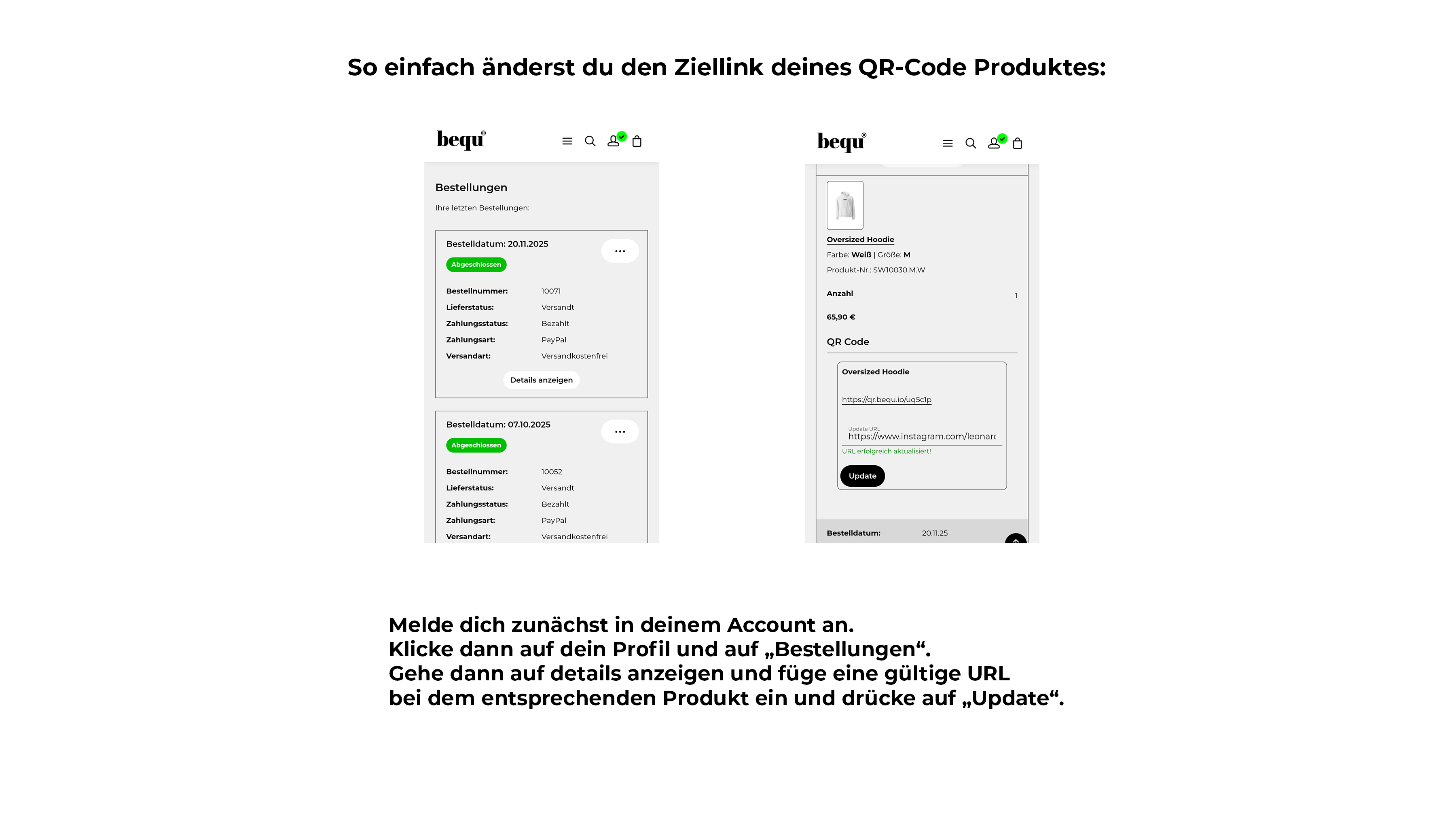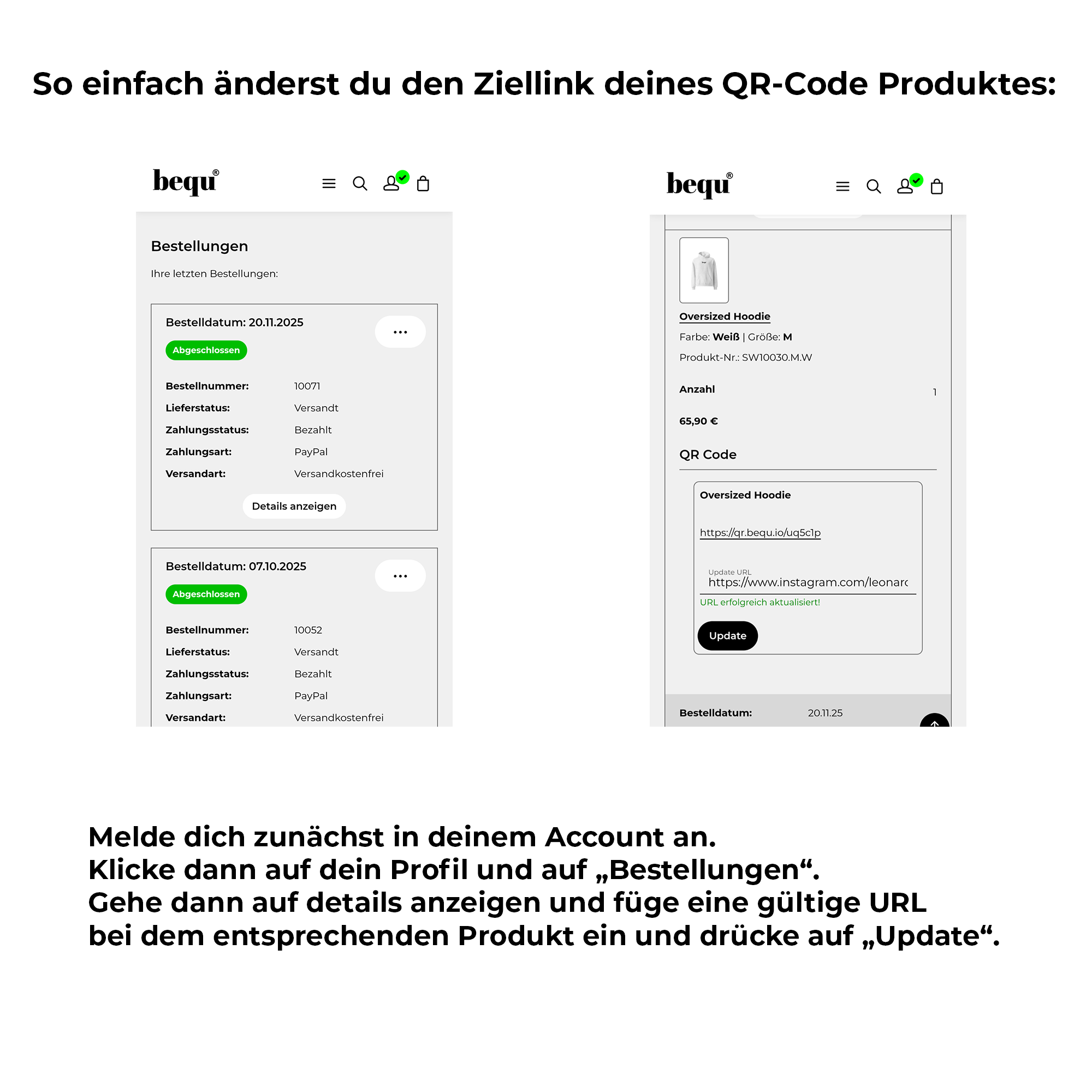 Diese Aufkleber verwandeln jede Oberfläche in dein persönliches Portal. Im Mittelpunkt steht der einzigartige, bequ QR-Code, der sofort ins Auge sticht. Verlinke deine Playlist, dein Social-Media-Profil oder dein neuestes Projekt und teile, was dich bewegt. Du entscheidest, wohin der Code führt – jederzeit und in Echtzeit änderbar. Jeder Sticker ist gefertigt aus langlebiger, wetterfester Folie, um aufzufallen und zu halten. Personalisiere dein Laptop, dein Smartphone oder dein Notizbuch und mache dein Statement überall sichtbar. Werde jetzt Teil der bequ-Community!Sticker Größe: ca. 7x7cmQR-Code Größe: ca. 5x5cm*Wir haften nicht für Schäden, die durch das verwenden von Aufklebern entstehen können. Hinweise: Lieferzeit: ca. 7-14 Werktage Besonderheit: Dieses Produkt wird nach deiner Bestellung individuell für dich mit einem einzigartigen, dynamischen QR-Code personalisiert. Bitte beachte, dass personalisierte Artikel vom gesetzlichen Widerrufsrecht ausgeschlossen sind. Hersteller des Endprodukts (gem. GPSR): Printful, Inc., 11025 Westlake Dr, Charlotte, NC 28273, USA